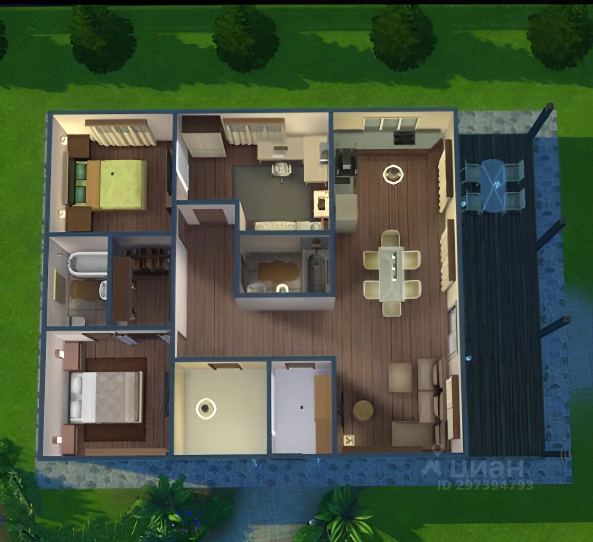 В доме три спальни, в одной из спален ванная комната и гардеробная, большая просторная кухня-гостинная с выходом на веранду, два санузла, техническое помещение, холл, тамбур.