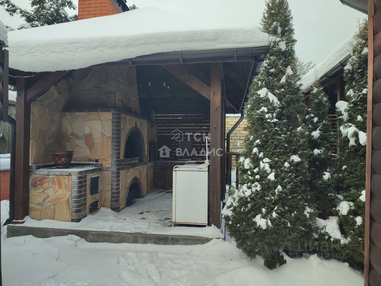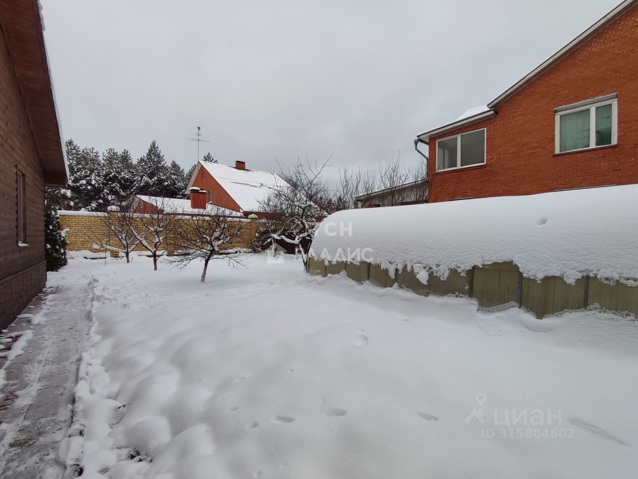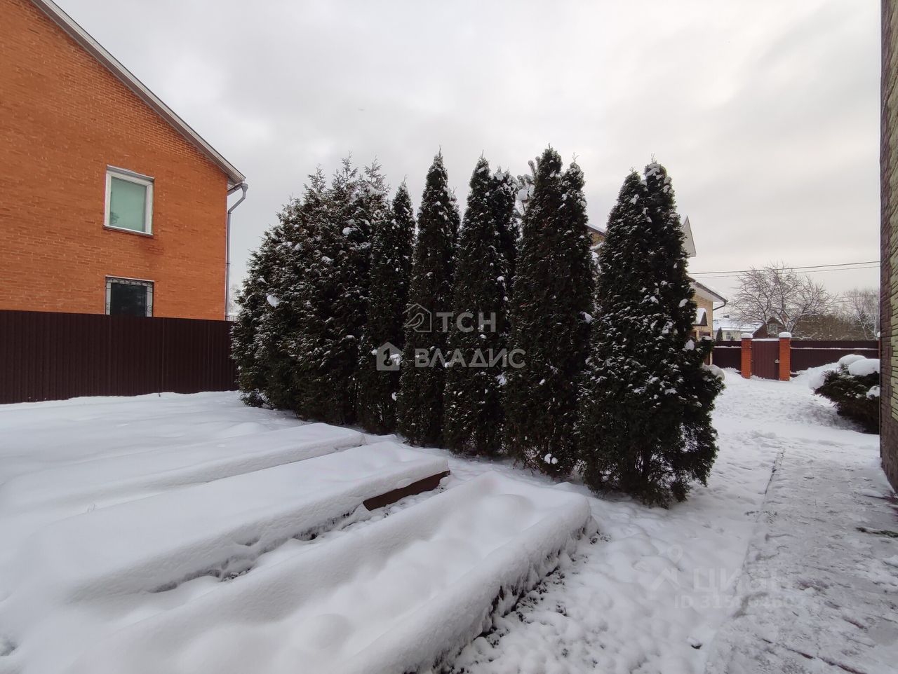 Участок огорожен со всех сторон капитальным забором, территория ухожена на ней растут плодовые деревья, хвойные деревья, кусты, ягодные кусты, стоит теплица, вольер для собаки. Въездная площадка перед домом, вымощенная плиткой, придаёт территории ухоженный и стильный вид.