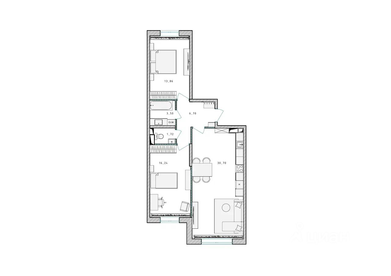 Продаётся 2-комнатная квартира в сданном доме (Корпус 1), срок сдачи: 4-кв. 2023, общей площадью 72.70 кв.м., на 15 этаже.