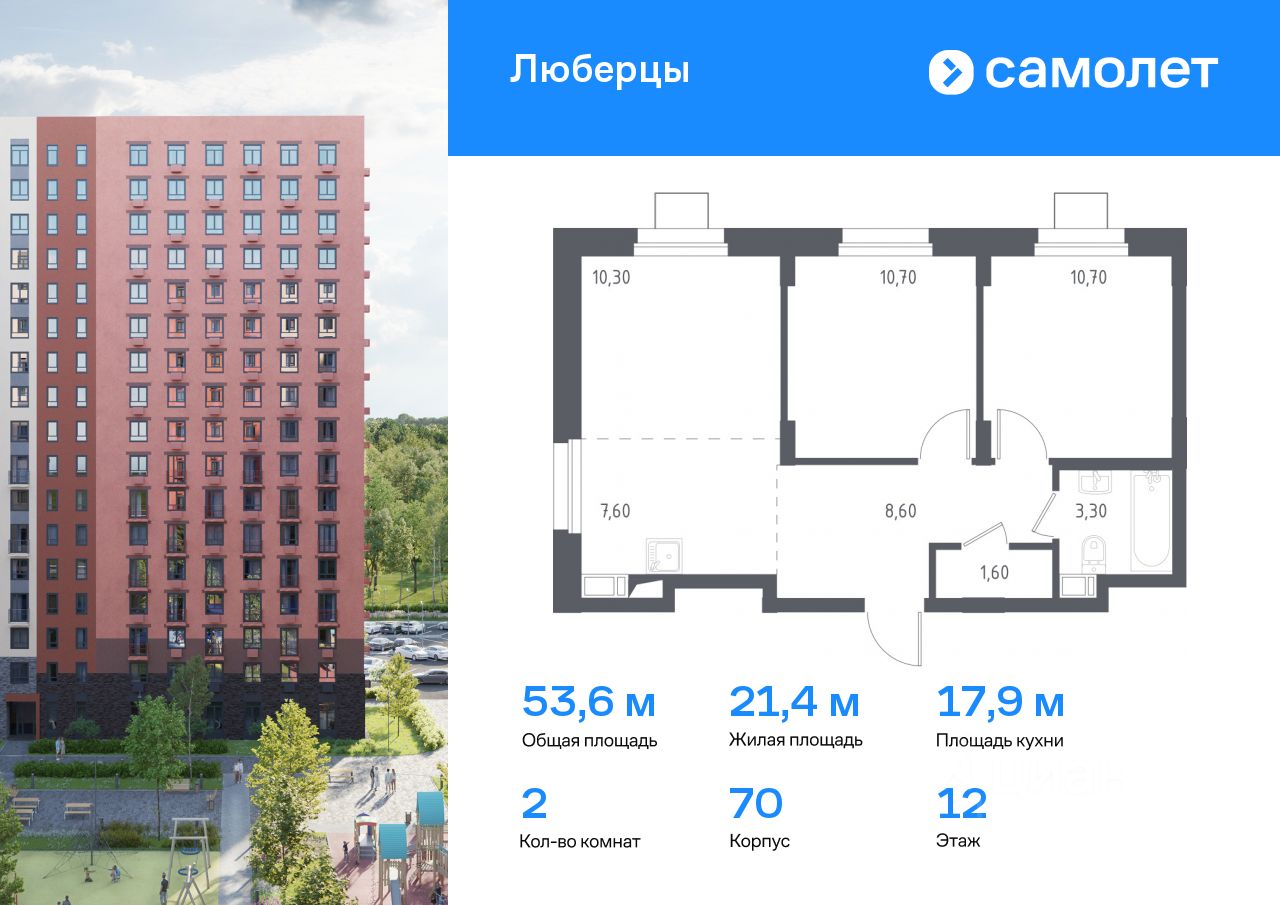 Предлагаются 2-комнатные апартаменты комфорт-класса 53,6 кв.м в корпусе 70 на 12 этаже, в ''Люберцы''