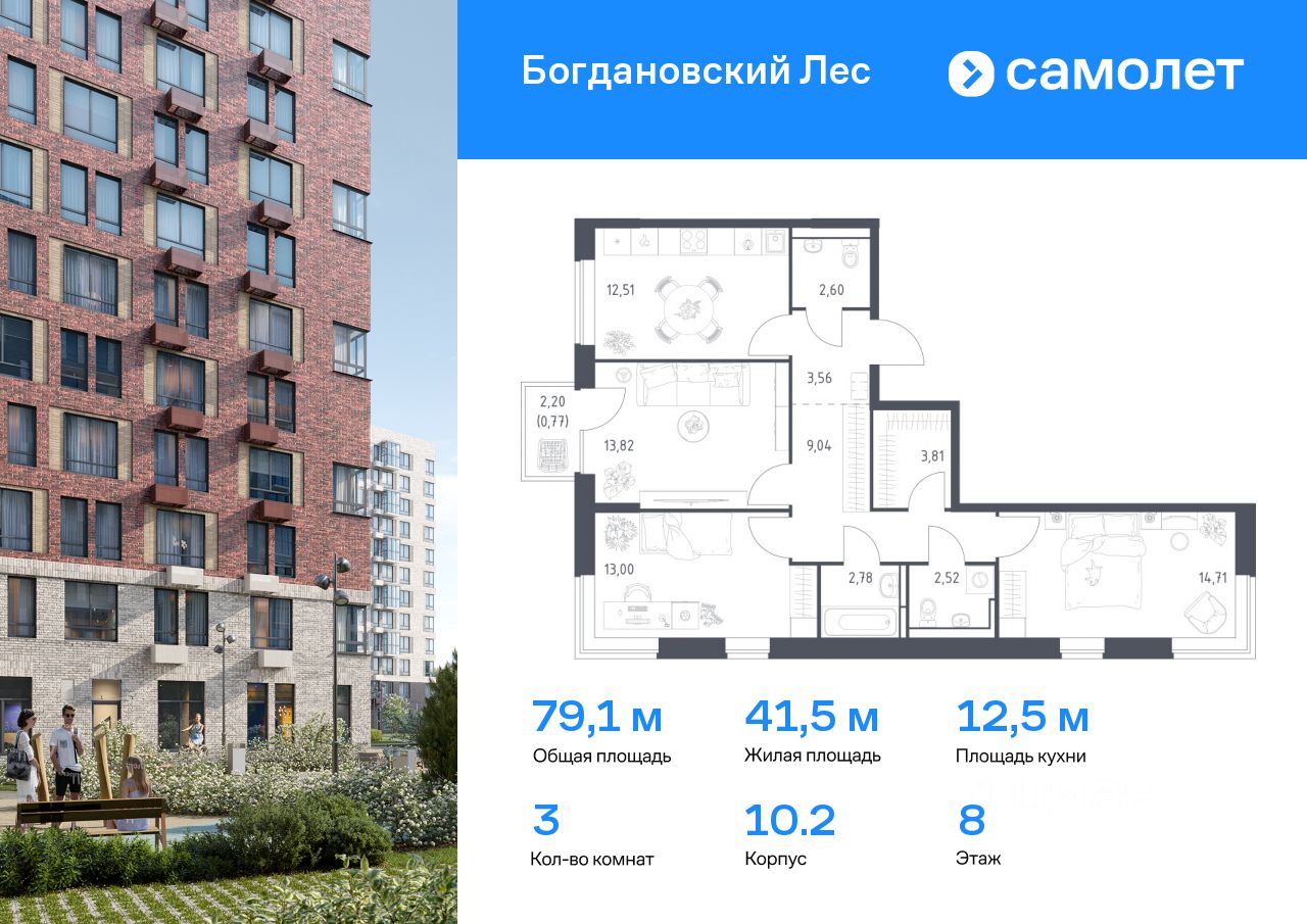Предлагается 3-комнатная квартира комфорт-класса 79,12 кв.м в корпусе 10.2 на 8 этаже, в ЖК ''Богдановский Лес'' Квартира без отделки. Доступность опции ''отделка'' и возможность комплектации мебелью и декором уточняйте у застройщика.