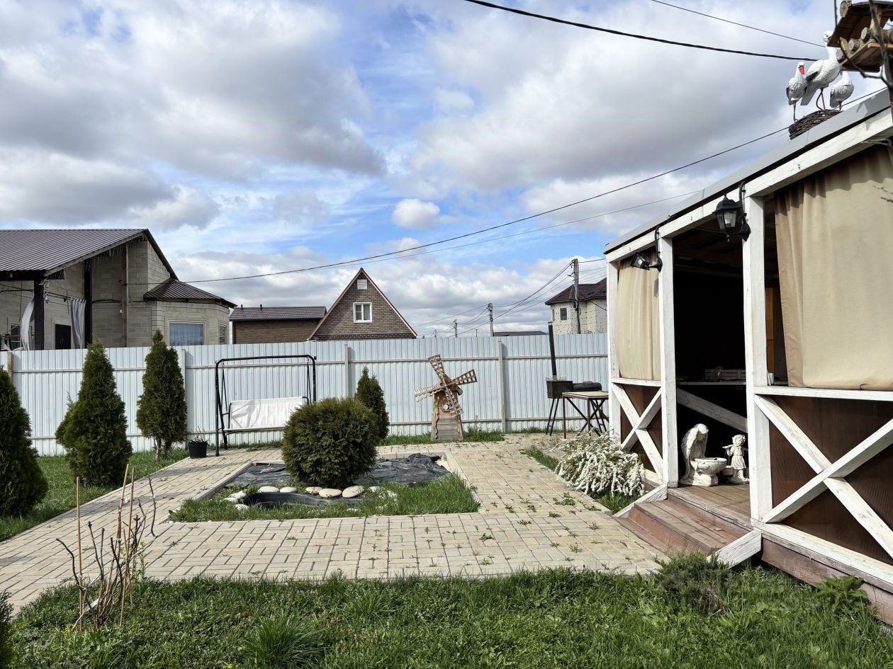 На участке расположена беседка, теплица, мангальная зона, качельки и декоративный пруд.