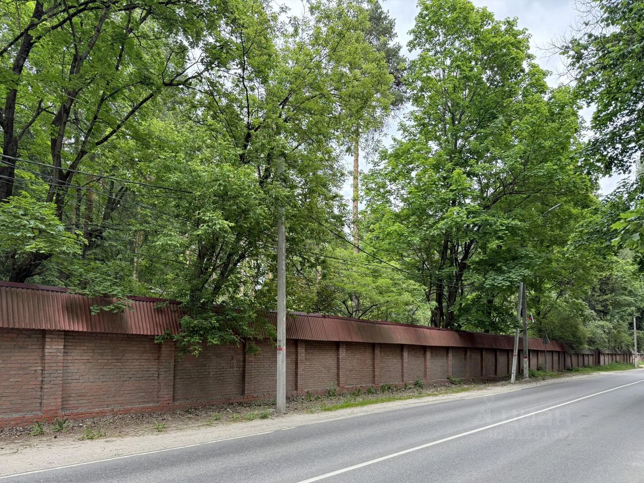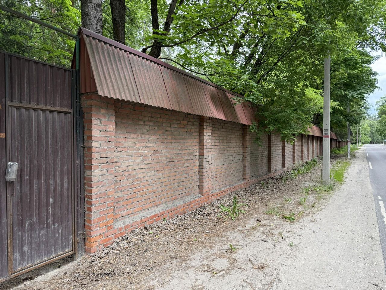 Высокий кирпичный забор со стороны дороги. Асфальт до участка.