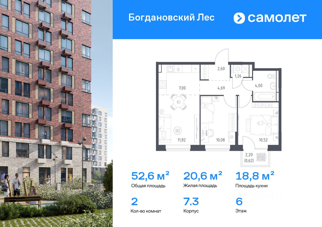Предлагается 2-комнатная квартира комфорт-класса 52,59 кв.м в корпусе 7.3 на 6 этаже, в ЖК ''Богдановский Лес'' Квартира с чистовой отделкой. Доступность дополнительных опций уточняйте у застройщика.