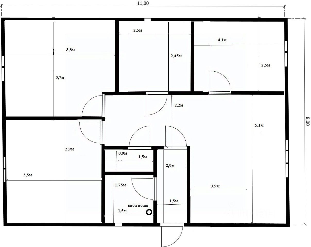 3 спальни, кухня-гостиная, санузел, котельная и холл.