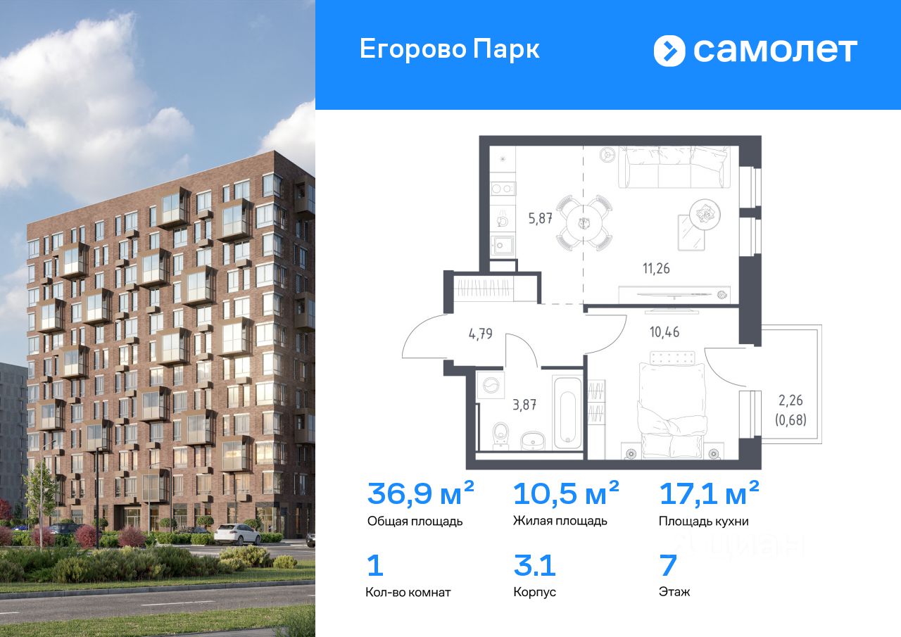 Строим кварталы для жизни с заботой о будущем. Предлагается 1-комнатная квартира комфорт-класса 36,93 кв.м в корпусе 3.1 на 7 этаже, в ЖК ''Егорово Парк''