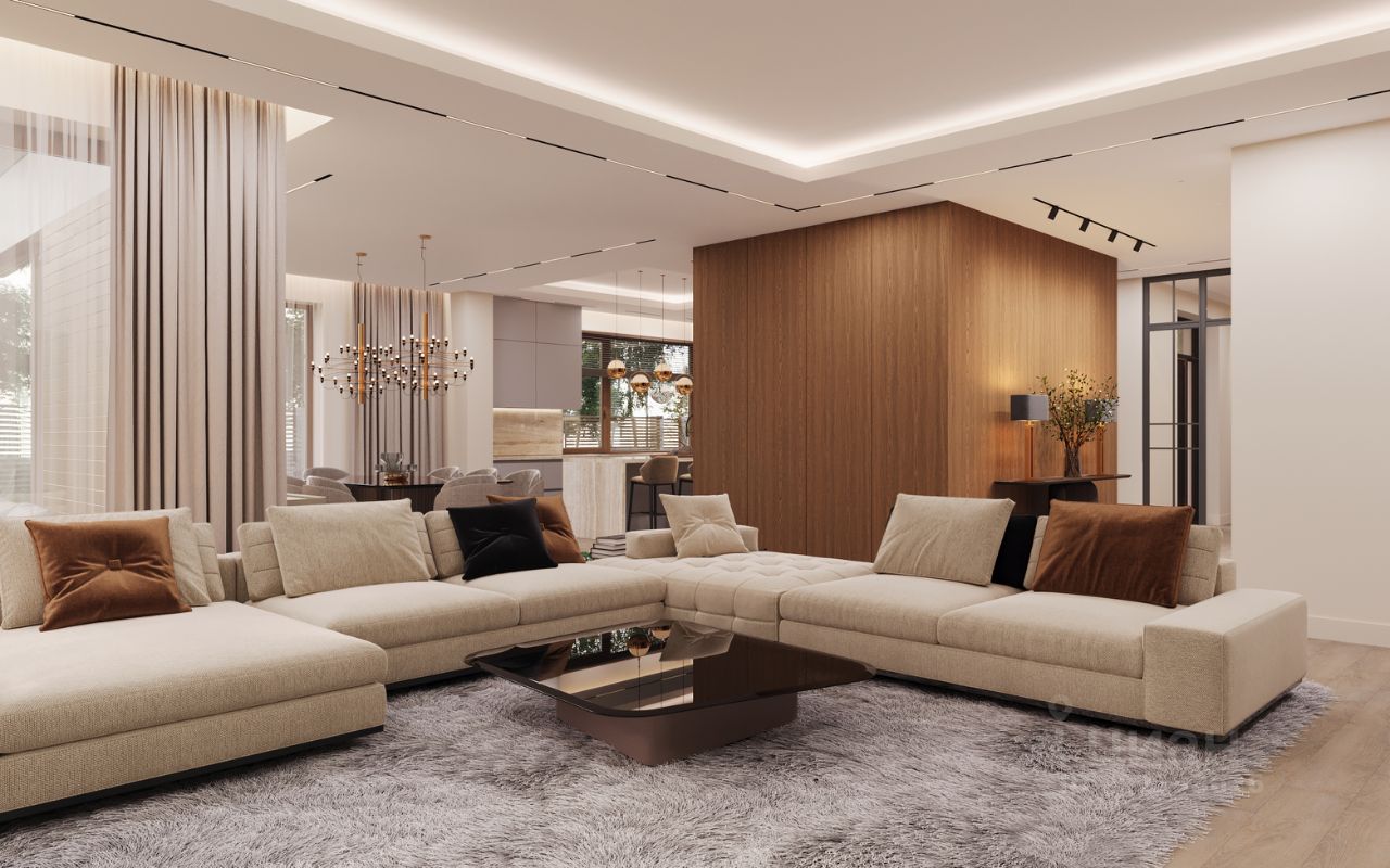 1 ЭТАЖ: гараж на 2 авто с хоз/помещением и котельной, прихожая, гардеробная, холл, кухня с кладовой-столовая-гостиная с выходом на патио и террасу, гостевая спальня с санузлом, комната для персонала (или вторая спальня), санузел. 2 ЭТАЖ: холл, 4 спальни, 3 санузла, гардеробные в каждой спальне, построчная, большая кладовая.