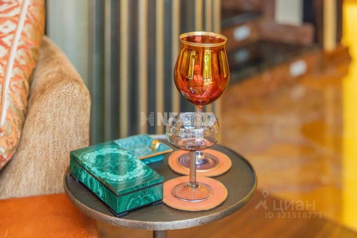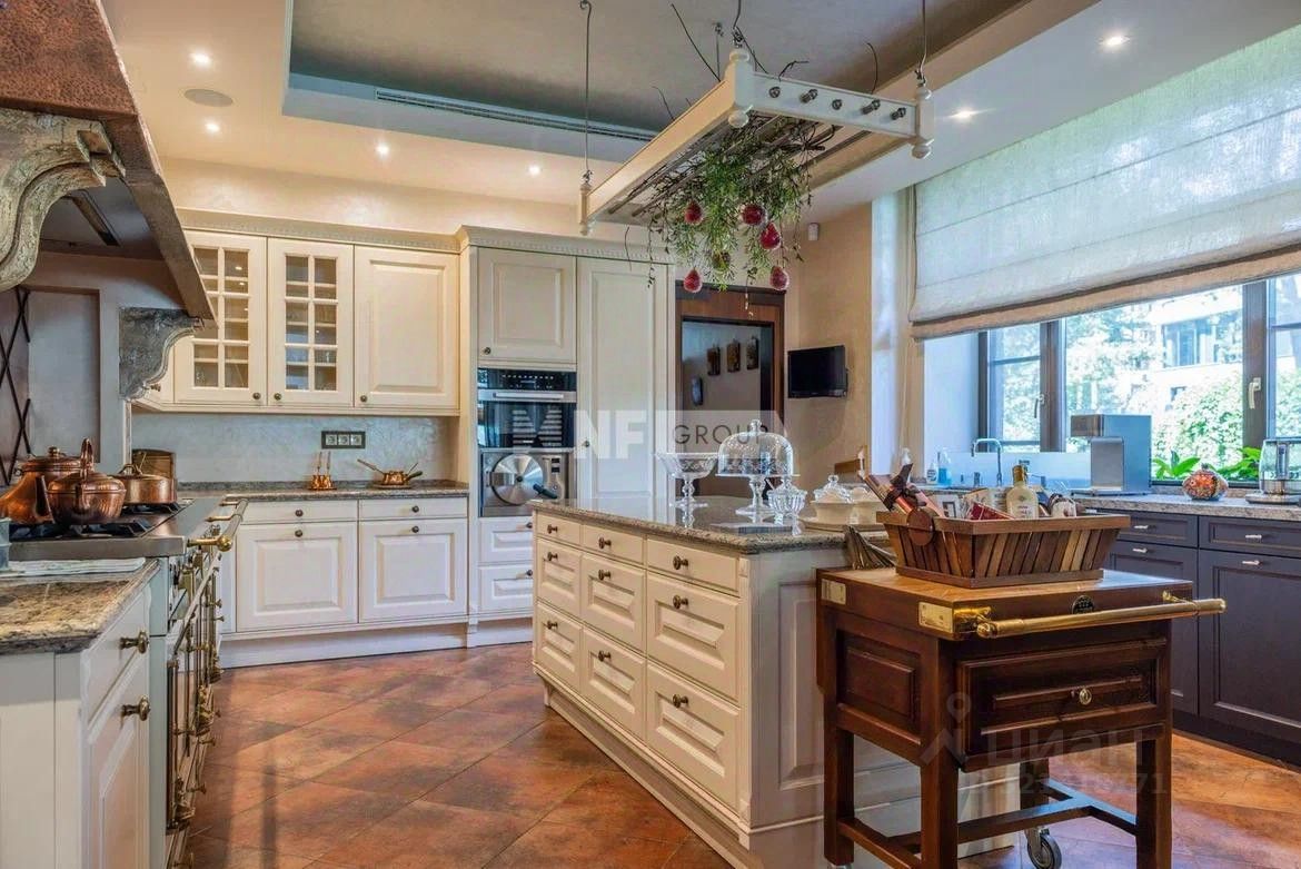 Роскошная гостиная с дровяным камином, вторым светом и панорамными окнами. Мастер-спальня с собственной гардеробной и санузлом, украшенным панно из полудрагоценного камня Pertified Wood. Восхитительная кухня, с нотками стиля Прованс, имеет панорамные окна в пол и выход на уютную террасу, оборудована профессиональной печью La Cornue (Франция), над которой выполнен вытяжной зонт, декорированный медью в старинной технике французских кухонь.