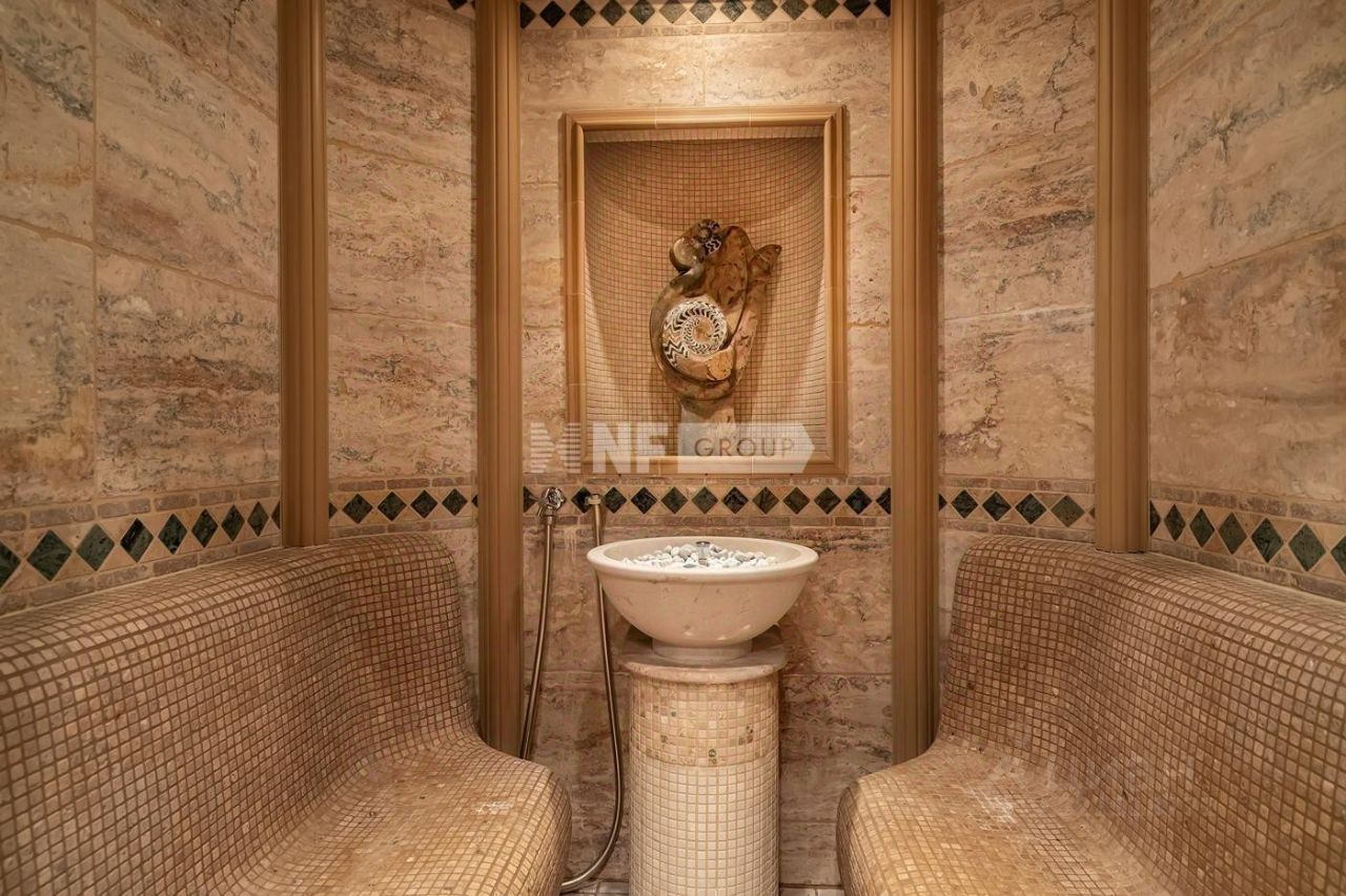 Роскошная гостиная с дровяным камином, вторым светом и панорамными окнами. Мастер-спальня с собственной гардеробной и санузлом, украшенным панно из полудрагоценного камня Pertified Wood. Восхитительная кухня, с нотками стиля Прованс, имеет панорамные окна в пол и выход на уютную террасу, оборудована профессиональной печью La Cornue (Франция), над которой выполнен вытяжной зонт, декорированный медью в старинной технике французских кухонь. Зона библиотеки и арт объектов, мастер-спальня со своей просторной гардеробной и санузлом с джакузи, который полностью облицован ониксом медового оттенка слэбами и в мозаике. Просторный зимний сад в марокканском стиле, две детские спальни со своими санузлами и гардеробными. На третьем этаже находится овальный кабинет хозяина, отделанный карельской березой, махагоном и орехом.