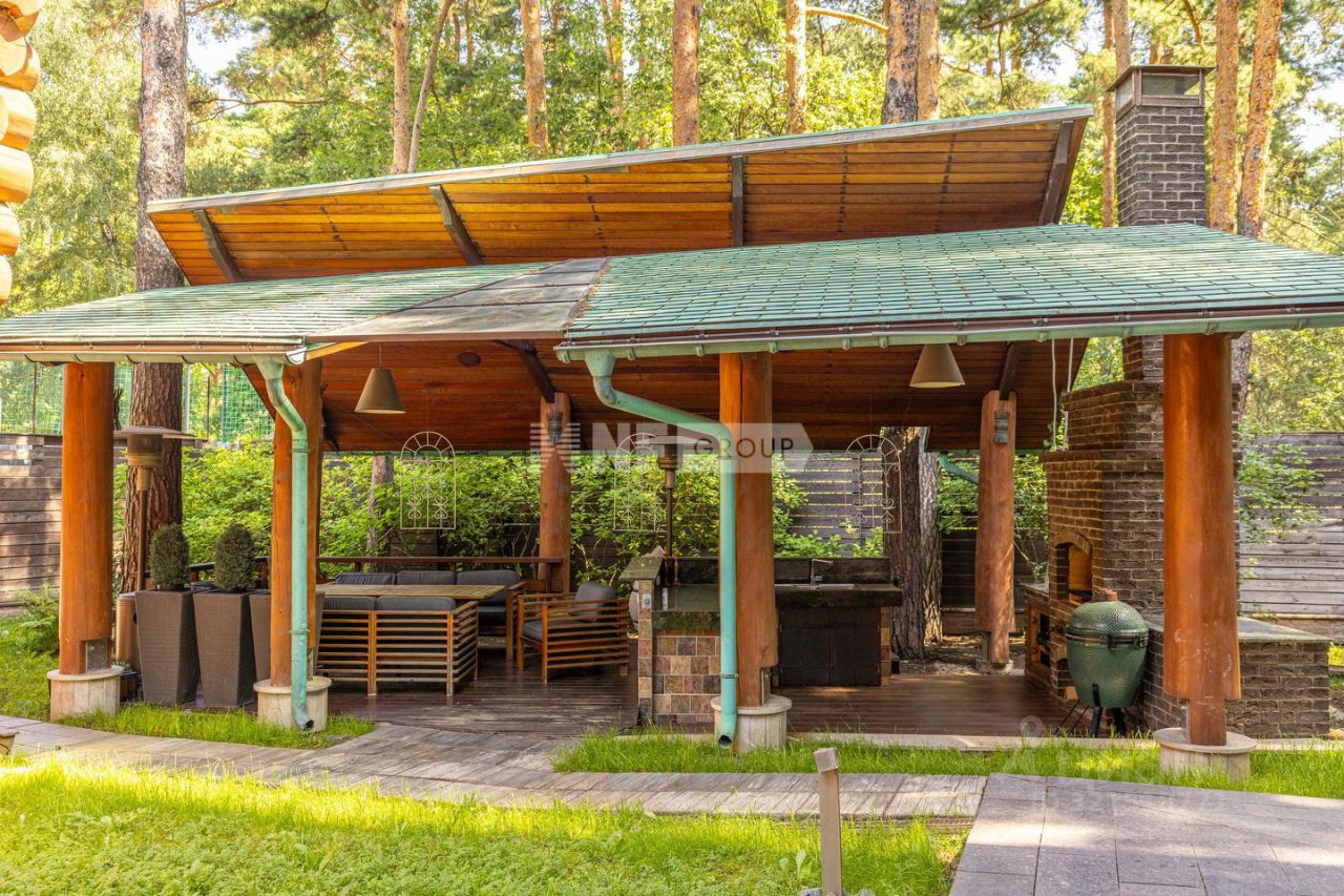 Выполнено благоустройство, разбит сад и дорожки, осуществлены уличные подсветки. Подведены все коммуникации. На территории имеется двухэтажная уникальная баня: сруб из цельных бревен сибирского кедра. На участке разбита беседка, имеется терраса из кухни. Завершается строительство крытой беседки с барбекю. На участке оборудован гараж на две машины с комнатой охраны / водителя и апартаменты для обслуживающего персонала. Баня из цельного сибирского кедрового бруса с печью Mironoff мелко дисперсного пара, двумя зонами отдыха, купелью и столом для мыльного массажа это изюминка данного домовладения!
