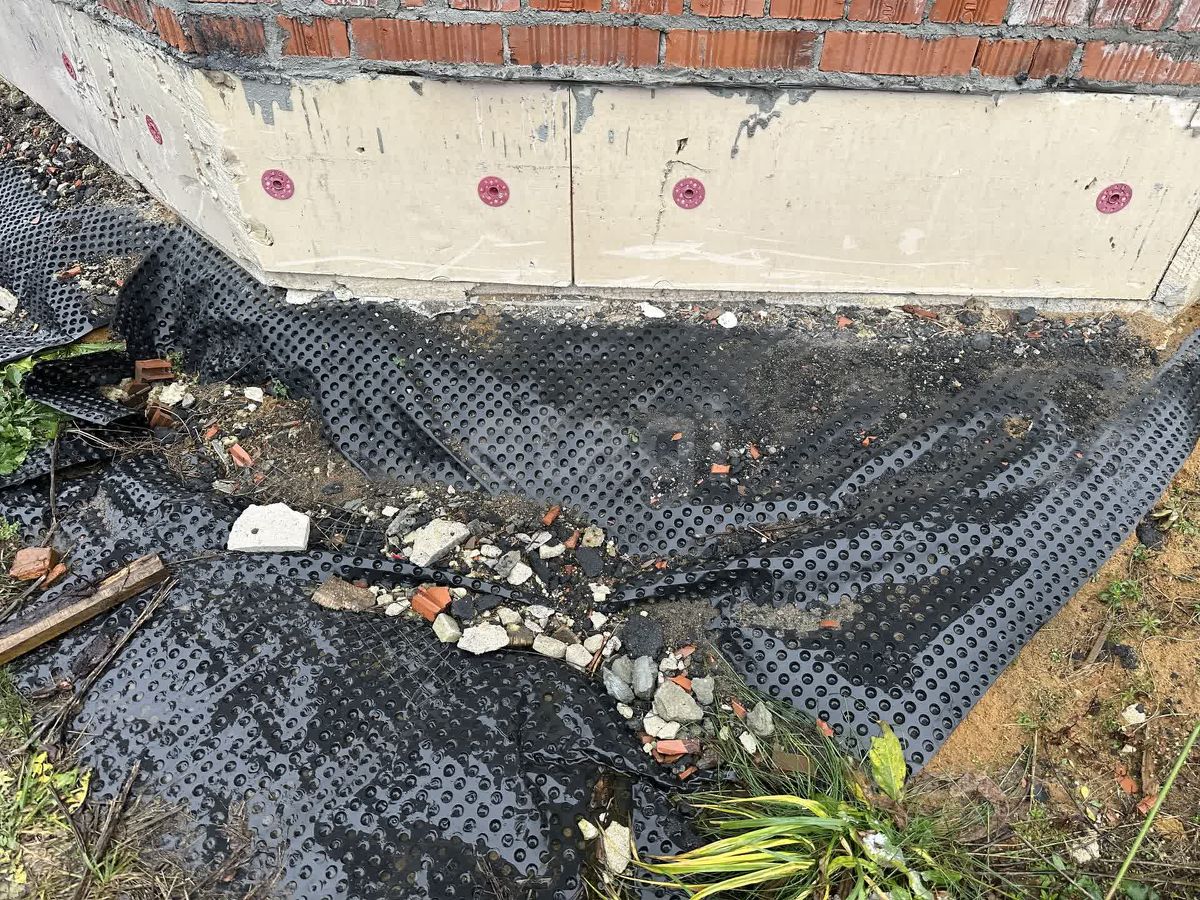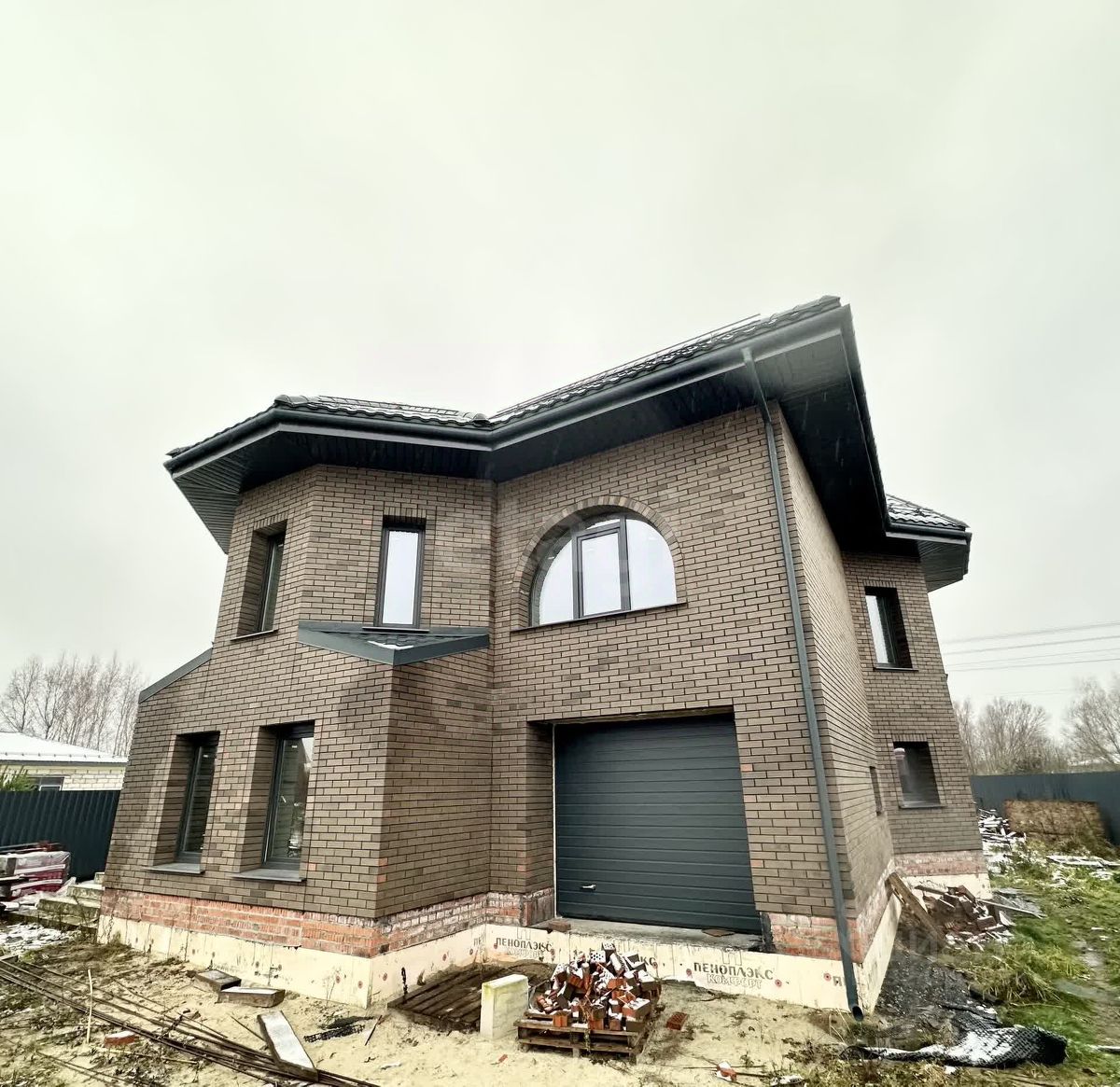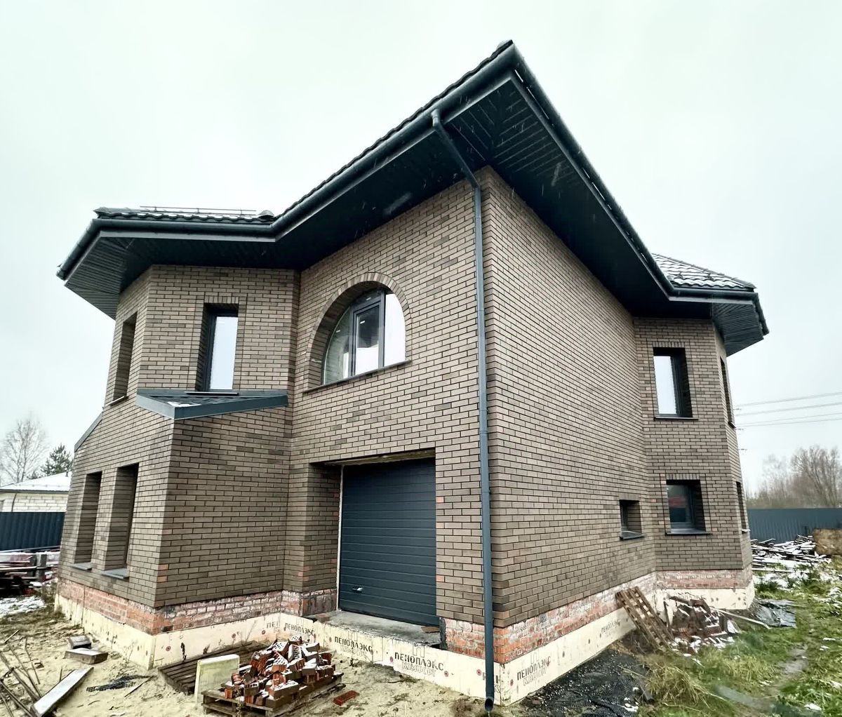 Фундамент дома - монолитная железобетонная плита 450 мм (практически все делают ленточный фундамент или монолитная плита не более 300 мм), утепленная пеноплесом со всех сторон (пол и торцы). Все закладные под коммуникации проведены в фундаменте. Стены из блока Воnоlit Рrоjесts D500 (толщина блока 400 мм, в основном строят 250-300 мм), утепленный ТехноНИКОЛЬ Техноблок Стандарт (толщина утеплителя 100 мм, в основном все строят без утепления стен, что ведет к потерям тепла и некомфортному микроклимату в доме), вентиляционный зазор- 30-40 мм с пазухами, облицовка кирпичом Баварская кладка, швы между кирпичом заполнены черным раствором. Межэтажное перекрытие