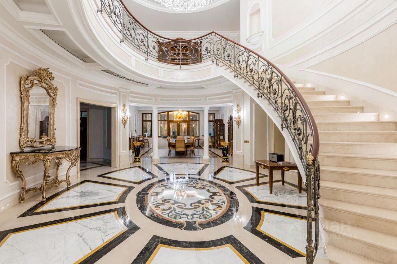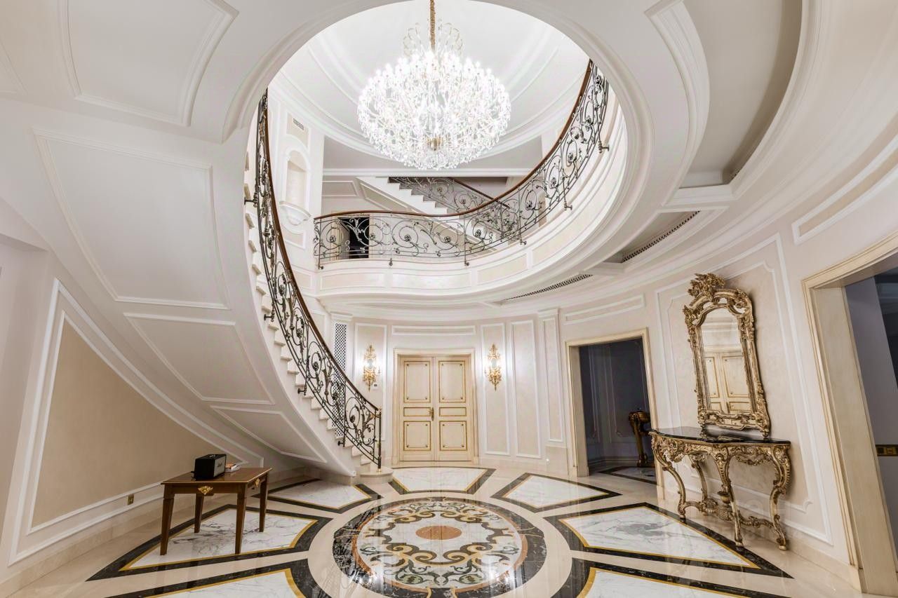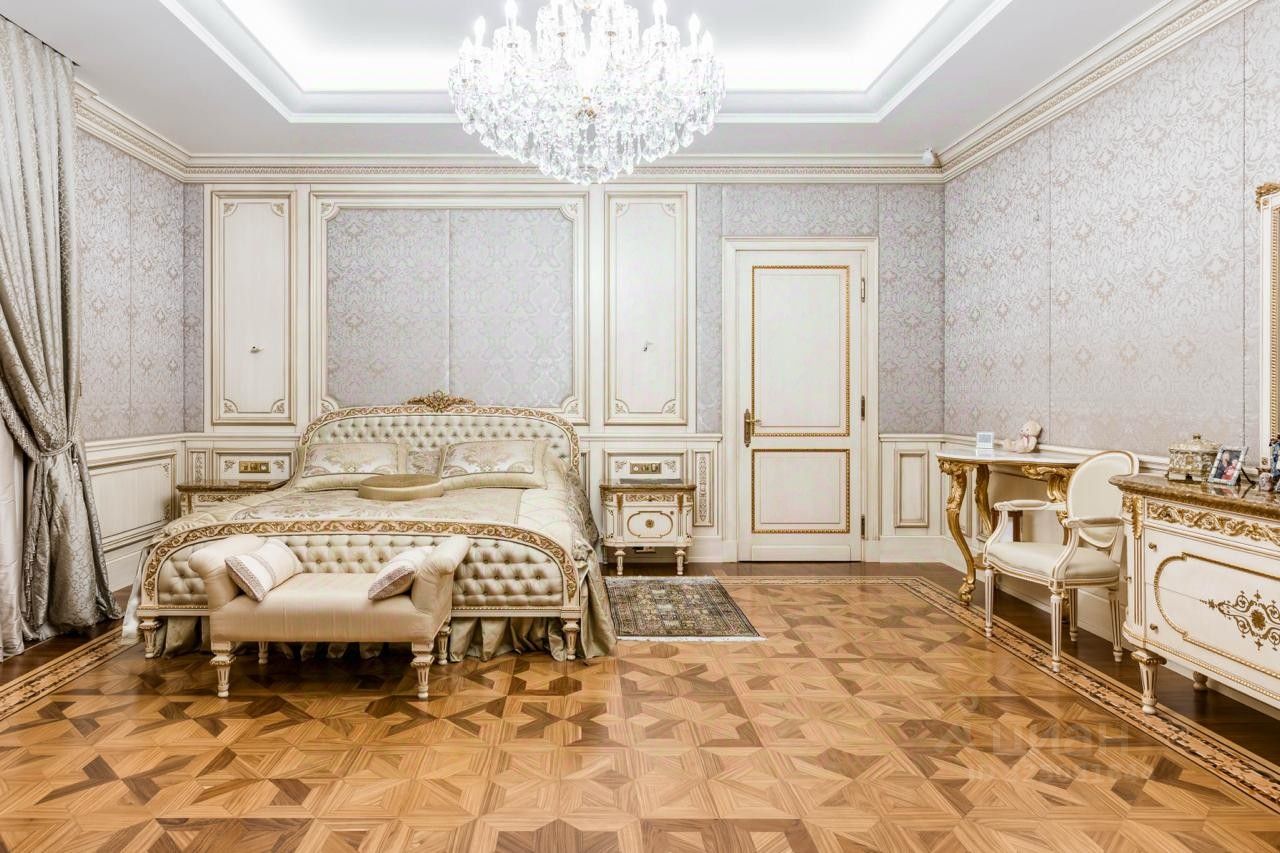 На втором этаже расположены мастер-спальня с двумя санузлами и гардеробными, а также две спальни с собственными санузлами и гардеробными. Третий этаж отведен под гостиную, три спальни, бильярдную и бар.