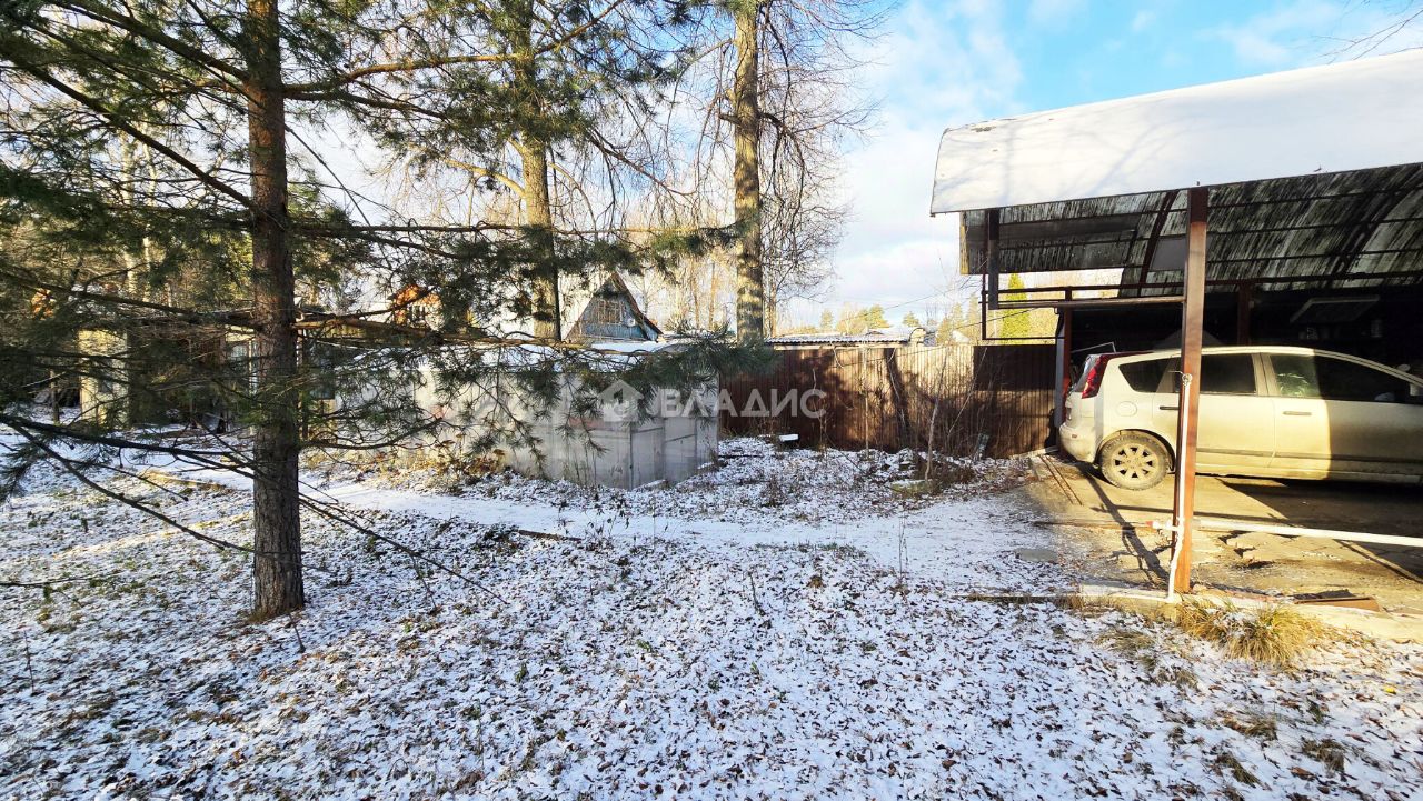 На ровном и сухом участке крытая стоянка для машины и хозяйственный домик. Растут плодовые деревья и кустарники.
