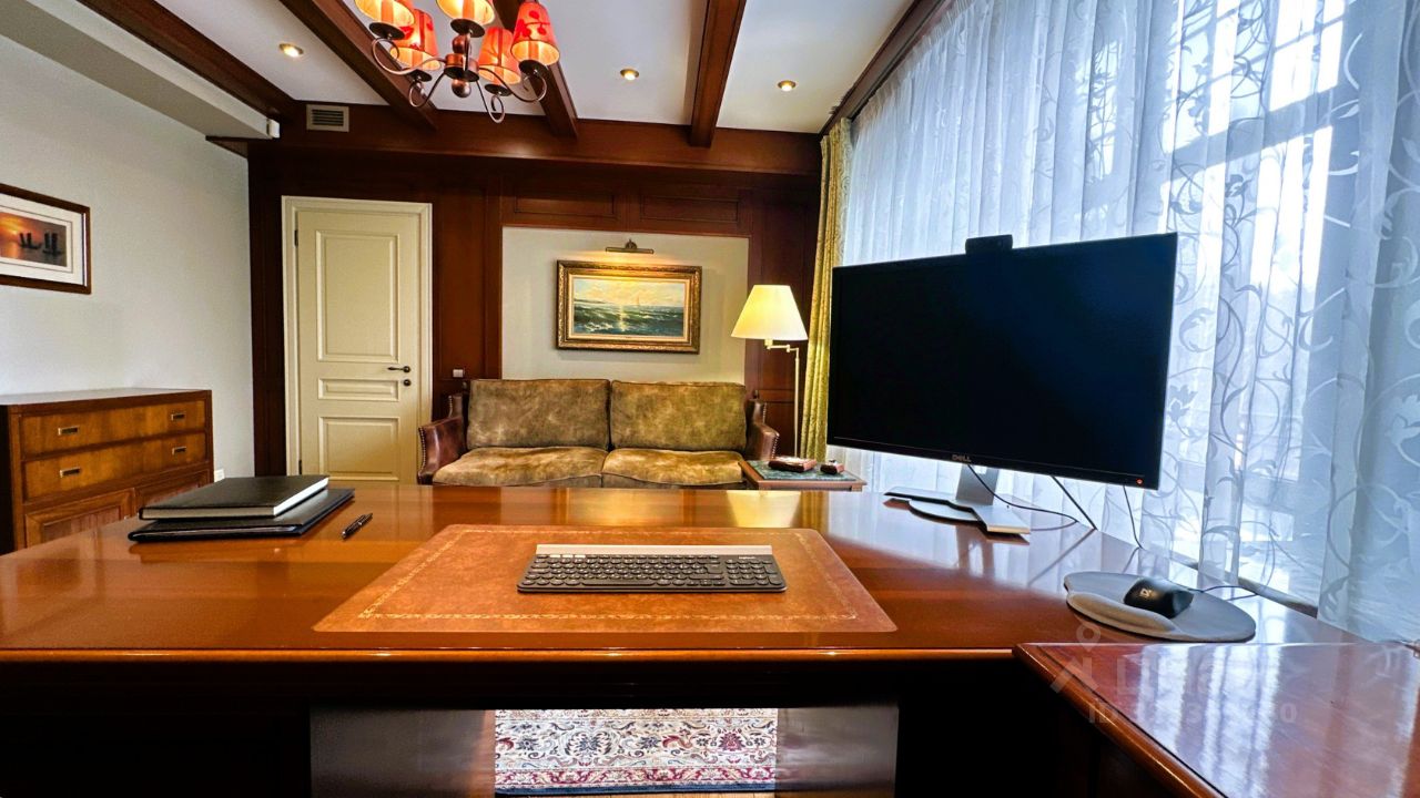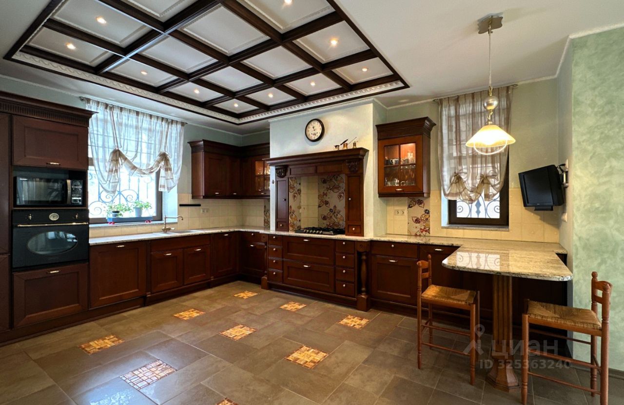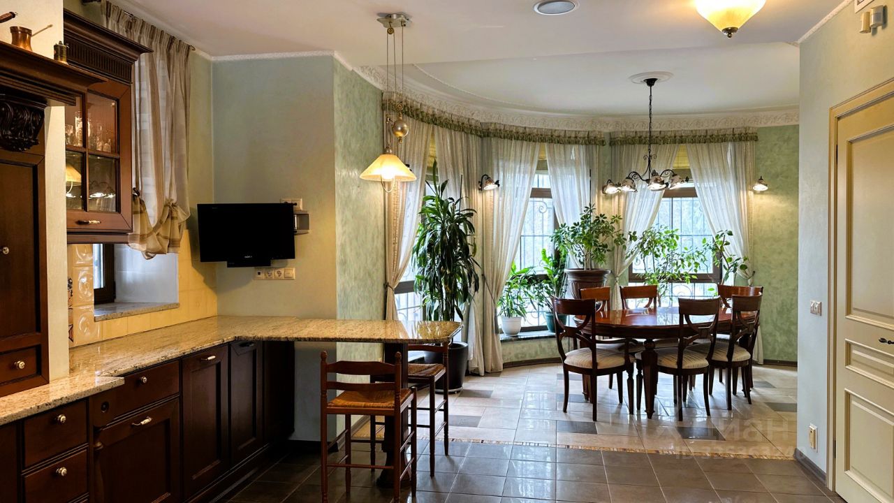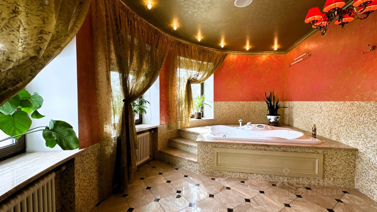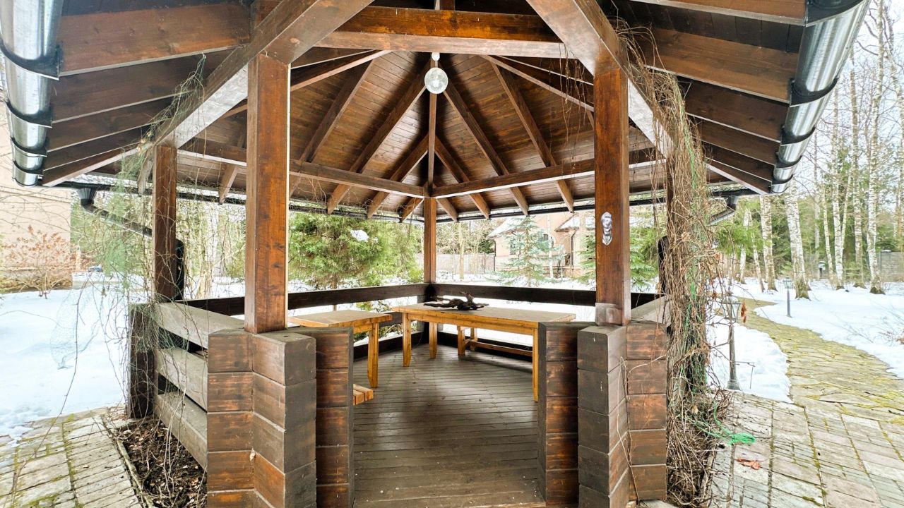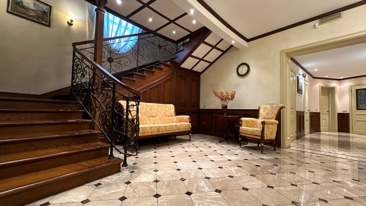 Об основном доме Дом имеет два этажа и мансарду. На первом этаже расположены просторная гостиная и кабинет-мастерская с камином и большими окнами, которые обеспечивают естественное освещение и создают уютную атмосферу. Через холл первого этажа можно попасть в кухню-столовую. В холле также находятся гостевой санузел, гардеробная, котельная и дополнительный выход на улицу. Кухня оборудована газовой плитой, оформленной в виде очага, а столовая зона расположена в эркере, что придаёт ей особый шарм и простор. В кухне также есть дополнительное помещение для размещения морозильника и хранения продуктов. На первом этаже предусмотрено водяное отопление пола, а пол покрыт натуральным мрамором. На втором этаже находятся библиотека, кабинет, мастер-спальня с ванной комнатой и джакузи, гостевая спальня с санузлом и гардеробная. Все эти помещения объединены просторным холлом второго этажа. Мансардный этаж отведён под зону отдыха с бильярдным столом, барной стойкой и мягкой мебелью. Здесь также расположены спальня и ванная комната, а также хозяйственная зона с прачечной и кладовой. В интерьере дома на втором этаже использованы дубовые доски, износостойкие ковровые покрытия с разнообразными орнаментами, тиснёные обои, витражи в дверях, мраморные подоконники в тон обоев и штор каждой комнаты, качественные ткани и портьеры. Английские классические камины и элегантная дубовая лестница с ажурным кованым ограждением создают единый образ этого дома. По всему дому установлена система приточно-вытяжной вентиляции. К дому примыкает тёплый гараж площадью 77 квадратных метров с комнатой отдыха, туалетом и душем, отдельным выходом на участок и розеткой для зарядки электромобиля. Входные зоны и зона въезда оснащены видеокамерами. Все строения подключены к резервной линии электроснабжения, а в отдельной постройке установлен генератор с автоматическим включением и мощные стабилизаторы для защиты от перепадов напряжения. Водоснабжение обоих домов обеспечивается многоступенчатой системой фильтрации. В доме есть элементы умного дома: высокоскоростной интернет с резервной линией, проведённой в цоколь дома, проводной интернет во всех комнатах, Wi-Fi, телефонные розетки, пневморозетки для центрального пылеудаления, аудиопроводка на всех трёх этажах со встроенными колонками, внутренняя сигнализация и сигнализация протечки в санузлах.
