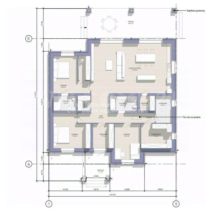О доме: Площадь — 218 м², дом спроектирован из современных материалов (газоблок/паратерм), возможно изменение проекта на каркасный вариант. Уже выполнен надёжный фундамент на монолитной плите с закладными элементами. Есть фотографии всех этапов изготовления фундамента, подтверждающие высокое качество строительных работ. Внутренняя структура дома включает кухню-гостиную площадью 55,9 м², три просторные комнаты, включая хозяйскую спальню, комфортную террасу 29 м², раздельный санузел и ванную комнату, удобное пространство для хранения вещей (гардероб), прихожую, холл и функциональную котельную.