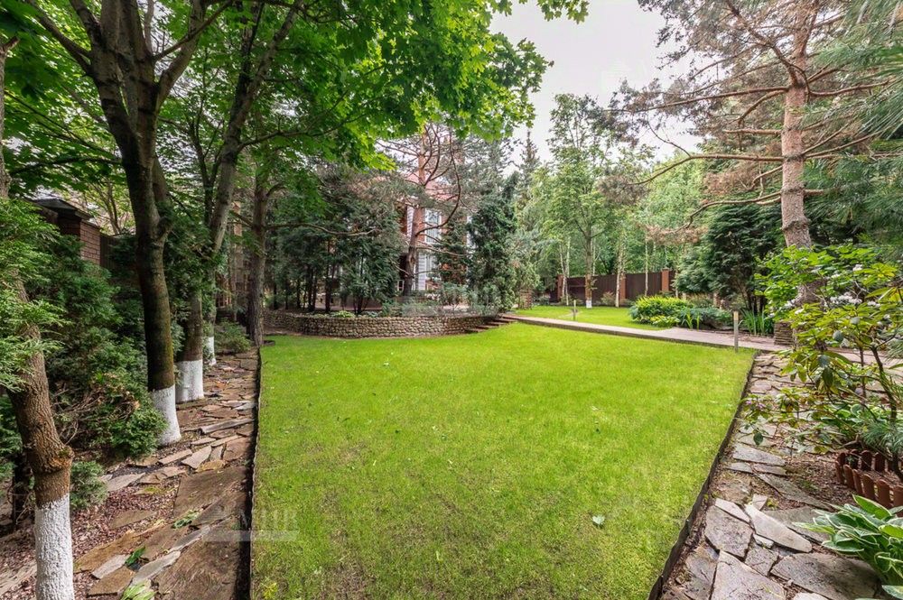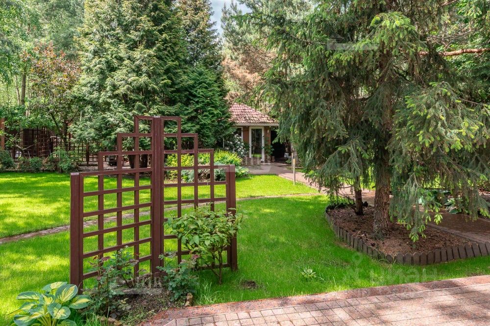 На участке хвойные и лиственные деревья, сосны, ели, кипарисовики, березы, декоративные растения, цветы, садовая зона с яблонями, грушами, вишней, смородиной, малиной, небольшой огород и пруд с альпийской горкой, места для отдыха, патио, качели и пр. Выполнены ландшафтные работы, централизованная система автополива, декоративный пруд и отапливаемый домик для барбекю.
