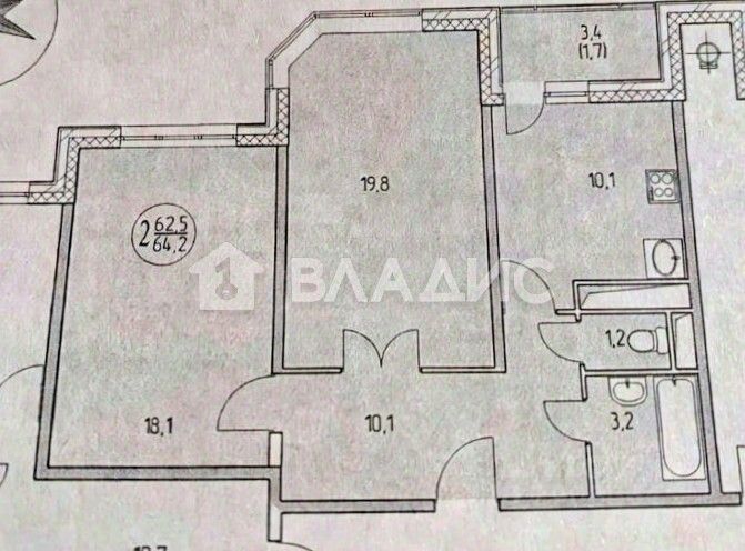 Общая площадь квартиры составляет 63,1 кв. м, из которых 37,9 кв. м — жилая площадь. Две изолированные комнаты (19,8 кв. м и 18,1 кв. м) и кухня площадью 10,1 кв. м создают удобное пространство для жизни. Квартира расположена не у угла дома, что обеспечивает дополнительную тишину и комфорт.